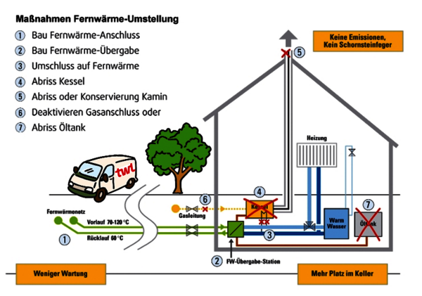 Verläuft unser Fernwärmenetz in der Nähe Ihres Gebäudes, ist die Umstellung auf TWL Fernwärme schnell und ohne größeren Aufwand umsetzbar. Die vorhandene Wärmeverteilung in Ihrem Objekt (Heizungsrohre und Heizkörper) bleibt in der Regel unverändert. Im Haus wird eine kompakte Fernwärme-Übergabestation installiert und an das bestehende Leitungssystem sowie an das in der Straße verlegte Fernwärmenetz angeschlossen. Für die Dimensionierung Ihrer Übergabestation müssen Sie die benötigte Anschlussleistung angeben.